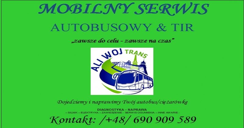 ALIWOJTRANS to firma z 10-letnim doświadczeniem w transporcie i serwisie. Specjalizujemy się w Autokarach, a także Samochodach Ciężarowych TIR. Posiadamy swoją stację Diagnostyczną i Wulkanizację w Poznaniu os.Sobieskiego118 oraz warsztat pojazdów wielkogabarytowych w Baranowie ul. Szamotulska 28.